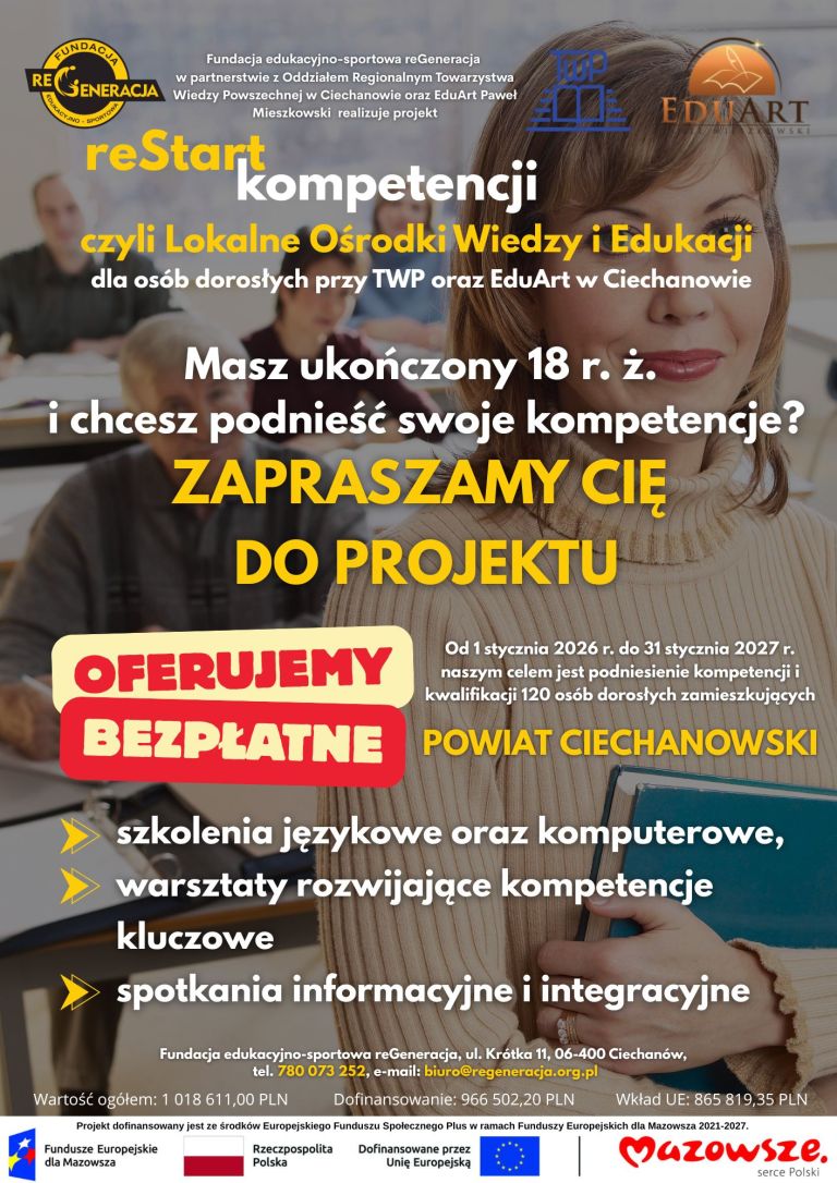 Fundacja reGeneracja to organizacja pozarządowa, która od lat wspiera dzieci, młodzież, seniorów oraz osoby zagrożone wykluczeniem społecznym na terenie Mazowsza. Naszą misją jest łączenie pokoleń, rozwijanie kompetencji społecznych i zawodowych oraz budowanie silnych więzi w lokalnej społeczności. Realizujemy innowacyjne projekty edukacyjne, integracyjne i obywatelskie, angażując mieszkańców w różnym wieku do wspólnego działania. Wierzymy, że dzięki współpracy i wzajemnemu wsparciu możemy tworzyć lepszą przyszłość dla wszystkich.