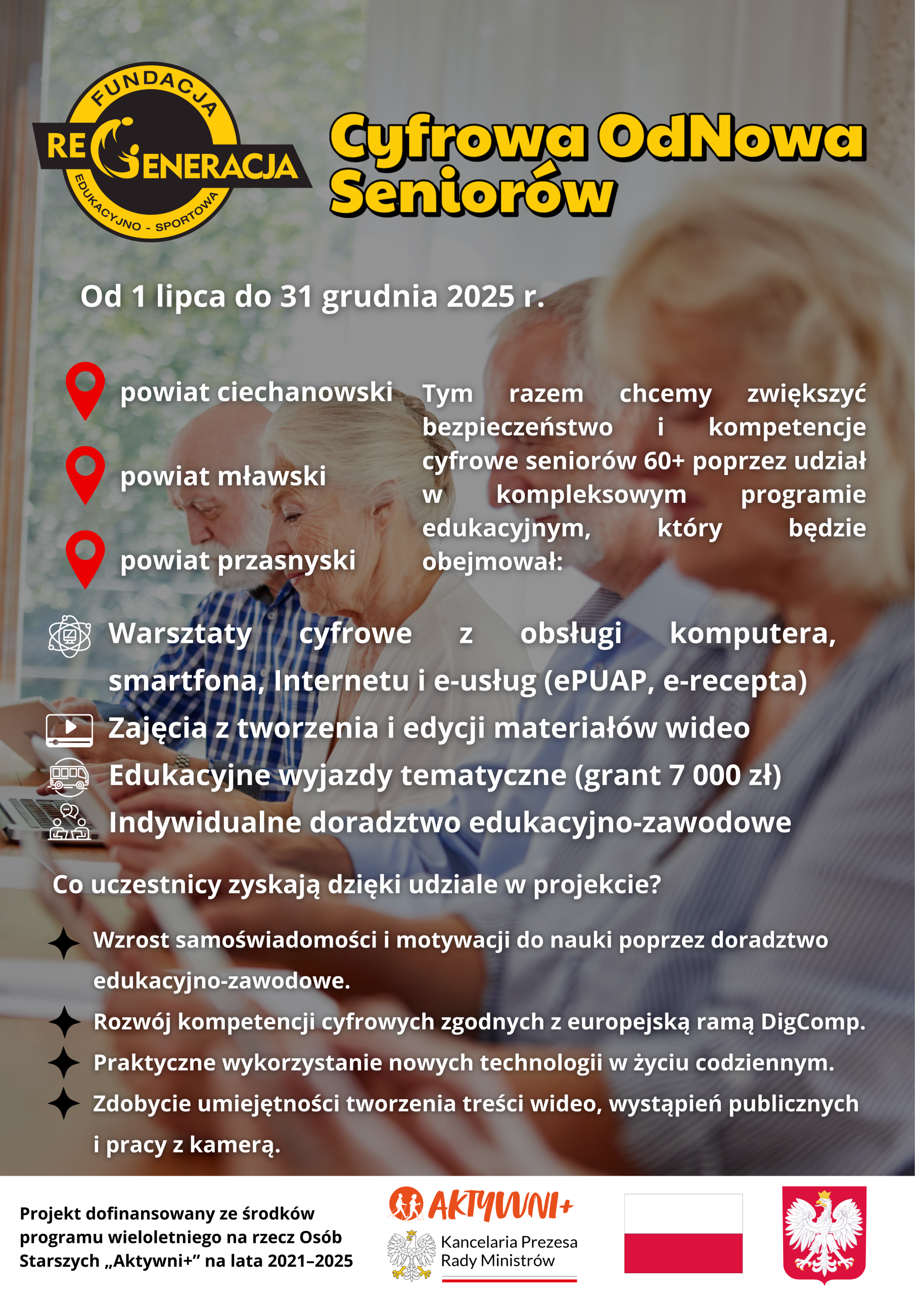 Od 1 lipca do 31 grudnia 2025 r. w powiatach: ciechanowskim, mławskim i przasnyskim realizujemy program edukacyjny dla osób 60+. Bądźcie czujni, ponieważ niedługo rusza rekrutacja, o której będziemy informować na naszym profilu na Facebooku! Naszym celem jest zwiększenie bezpieczeństwa i kompetencji cyfrowych seniorów poprzez: